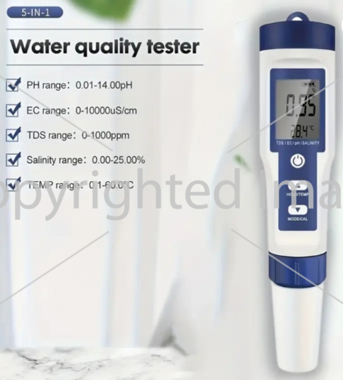5-in-1 rəqəmsal su keyfiyyəti test cihazı həm məişət, həm də peşəkar şəraitdə əsas su parametrlərinin sürətli və dəqiq monitorinqi üçün nəzərdə tutulmuşdur.