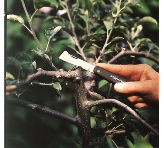 Fiskars peyvənd bıçağı 1001625 (125900) kolları və bitkiləri kəsmək və budamaq üçün istifadə olunur. Bıçaq bıçağı korroziyaya qarşı qorunma təmin edən yüksək karbonlu poladdan hazırlanmışdır. Tutacaq təkrar emal edilmiş plastikdən hazırlanmışdır və alətdən rahat istifadə üçün rahat əyri formaya malikdir. Dəstəyin sonunda aləti asmaq üçün bir çuxur var