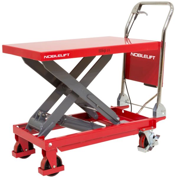 NOBLELIFT TG50 qaldırıcı platforma ilə araba. Modelin qaldırma qabiliyyəti 500 kq, platformanın maksimum qaldırma hündürlüyü 915 mm, masa platformasının ölçüsü 1600x810 mm-dir. NOBLELIFT TF50 modelindən fərqli olaraq, TG500 mobil qaldırıcı masa, artan yük qabiliyyətinə əlavə olaraq, artan iş platforması sahəsinə və daha yüksək qaldırma hündürlüyünə malikdir. Maksimum qaldırma hündürlüyü 55 fut pedal dövrü ilə əldə edilir.