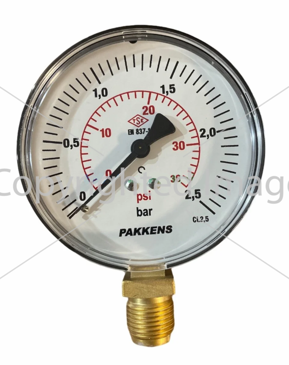 Manometr quru tipli (0-2,5 bar 50 mm, G1/4"B alt bağlantı metal gövdə) Pakkens 0501000104MG