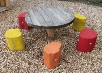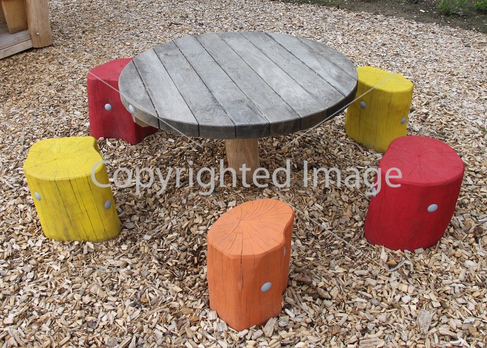 Деревянный детский столик с круговой столешницей и табуретами предназначен для игр, творчества и отдыха на свежем воздухе