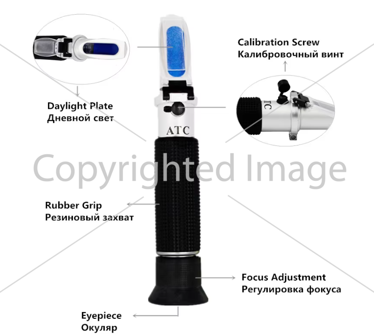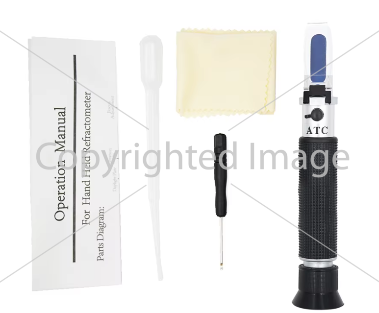 Рефрактометр, пипетка для взятия пробы, отвертка для калибровки, салфетка, инструкция