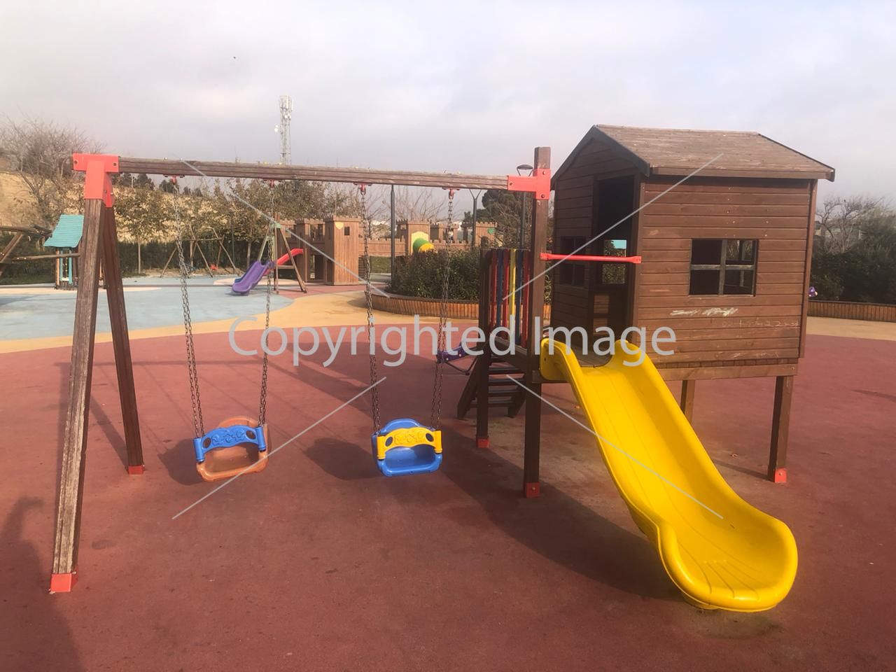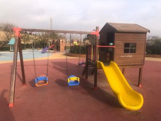 Домик оснащен навесом для защиты от солнца, маленькие качели и горка